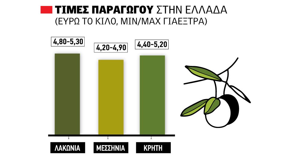 Στην πράξη αυτό σημαίνει ότι, σε αρκετές περιπτώσεις, οι παραγωγοί που επιθυμούν να πουλήσουν άμεσα βρίσκουν σήμερα τιμές στη Μεσσηνία από περίπου 4,20 ευρώ το κιλό για ελαιόλαδα με οριακές οξύτητες έως περίπου 4,90 ευρώ για ελαιόλαδα τριών γραμμών. Στη Λακωνία οι τιμές κινούνται συνήθως μεταξύ 4,80 και 5,30 ευρώ το κιλό για οξύτητες έως 0,6, ενώ στην Κρήτη παρατηρείται τις τελευταίες ημέρες ακόμη μεγαλύτερη κλιμάκωση, με τιμές από περίπου 4,40 έως και 5,20 ευρώ το κιλό για οξύτητες από 0,3 έως 0,6.