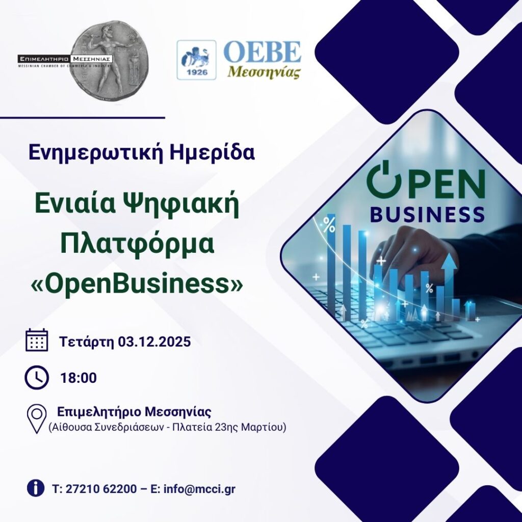 Με στόχο να παρουσιαστεί αναλυτικά η λειτουργία και οι δυνατότητες της Ενιαίας Ψηφιακής Πλατφόρμας OpenBusiness, το Επιμελητήριο Μεσσηνίας, σε συνεργασία με την Ομοσπονδία Επαγγελματικών, Βιοτεχνικών και Εμπορικών Σωματείων Ν. Μεσσηνίας, προχωρά στη διοργάνωση μιας εξειδικευμένης ενημερωτικής ημερίδας την Τετάρτη 3 Δεκεμβρίου 2025, στις 18:00, στην αίθουσα συνεδριάσεων του Επιμελητηρίου στην Πλατεία 23ης Μαρτίου. Η πρωτοβουλία έρχεται σε μια περίοδο όπου η ψηφιοποίηση των διαδικασιών αποτελεί μονόδρομο για τις επιχειρήσεις που θέλουν να παρακολουθήσουν τις εξελίξεις και να αποφύγουν τη γραφειοκρατική φθορά που ακόμη επιμένει σε πολλές υπηρεσίες.