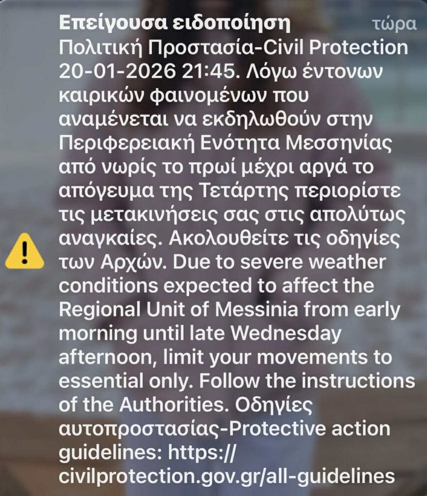 Να περιορίσουν τις μετακινήσεις τους στις απολύτως απαραίτητες συνιστά στους κατοίκους της Μεσσηνίας η Πολιτική Προστασία, καθώς από το πρωί της Τετάρτης έως και το απόγευμα της Πέμπτης αναμένονται επικίνδυνα καιρικά φαινόμενα με ισχυρές βροχοπτώσεις και χιονοπτώσεις στα ορεινά.