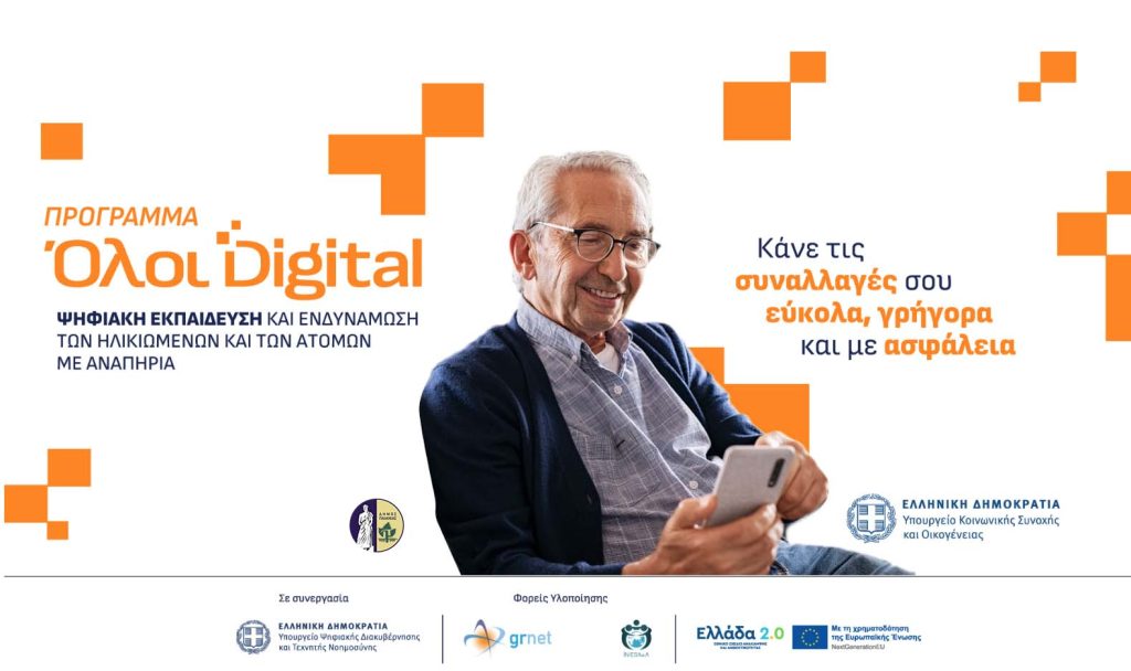 Συγκεκριμένα, το Υπουργείο Κοινωνικής Συνοχής και Οικογένειας με την υποστήριξη του Υπουργείου Ψηφιακής Διακυβέρνησης, σε συνεργασία με το Εθνικό Δίκτυο Υποδομών Τεχνολογίας και Έρευνας (ΕΔΥΤΕ) και το Ινστιτούτο της Εθνικής Συνομοσπονδίας Ατόμων με Αναπηρία και Χρόνιες Παθήσεις υλοποιούν το πρόγραμμα «Όλοι Digital» για την Ψηφιακή Ενδυνάμωση Ηλικιωμένων και των Ατόμων με Αναπηρία. Το πρόγραμμα υλοποιείται στο πλαίσιο του έργου «Ψηφιακή εκπαίδευση και ενδυνάμωση των ηλικιωμένων και των ατόμων με αναπηρία» το οποίο εντάσσεται στο Εθνικό Σχέδιο Ανάκαμψης και Ανθεκτικότητας «Ελλάδα 2.0» με την χρηματοδότηση της Ευρωπαϊκής Ένωσης.