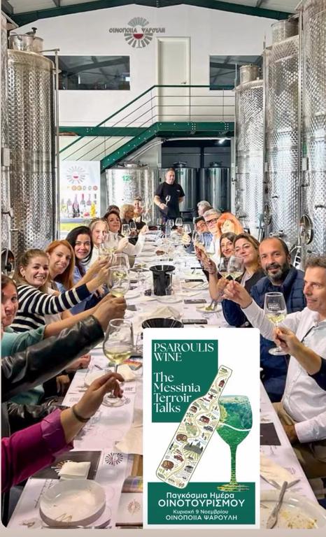 Στο επίκεντρο του ελληνικού οινοτουρισμού βρέθηκε η Μεσσηνία, μέσα από τη συνάντηση “The Messinia Terroir Talks at Psaroulis Wines – A Private Meeting with Decision Makers & Press about Wine Experiences”, που πραγματοποιήθηκε την Κυριακή 9 Νοεμβρίου στην Οινοποιία Ψαρούλη, με αφορμή την Παγκόσμια Ημέρα Οινοτουρισμού.