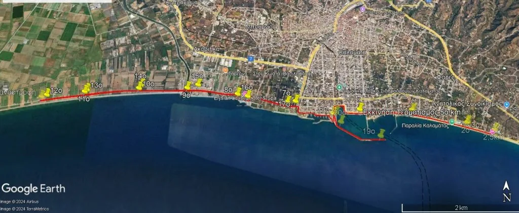 ΔΙΑΔΡΟΜΗ: Πιστοποιημένη από την A.I.M.S διαδρομή, γρήγορη, δίπλα στην παραλία είναι ασφάλτινη και επίπεδη χωρίς υψομετρικές διαφορές και με σημείο εκκίνησης την προκυμαία του Κεντρικού Λιμένα Καλαμάτας. Οι δρομείς αρχικά θα κινηθούν ανατολικά μέσω της παραλιακής οδού Ναυαρίνου με κατεύθυνση προς το ξενοδοχείο “Elite”, όπου θα γίνει αναστροφή. Επιστρέφοντας από την οδό Ναυαρίνου, είσοδος στο Πανελλήνιο (Ακρίτας και Ναυαρίνου) θα διέλθουν από το χώρο εκκίνησης και στη συνέχεια από το λιμάνι- Λιμεναρχείο, και θα συνεχίσουν μέσω της μαρίνας προς τον Κορδία και τη Δυτική Παραλία. Θα διέλθουν από τις εγκαταστάσεις της Πολεμικής Αεροπορίας και θα κάνουν αναστροφή. Στη συνέχεια και επιστρέφοντας από την ίδια διαδρομή ,μετά τη μαρίνα, πορεία στο χιλιόμετρο (φάρο) θα επιστρέψουν στο σημείο εκκίνησης. Οι αθλητές της σκυταλοδρομίας θα μεταφερθούν με λεωφορείο στη ζώνη αλλαγής αμέσως μετά την εκκίνηση του αγώνα.