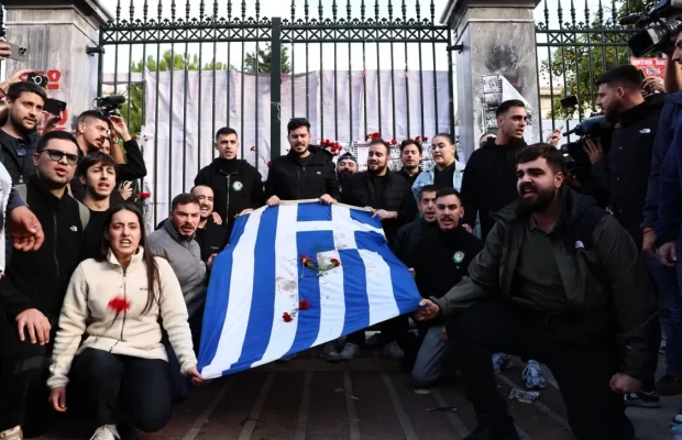 Η ιστορική σημαία του Πολυτεχνείου έφθασε νωρίτερα έξω από την πρεσβεία περίπου στις 17:00 το απόγευμα της Πέμπτης. Κατά την απομάκρυνσή της κάποιοι από τους διαδηλωτές επιχείρησαν να σπάσουν τον αστυνομικό φραγμό, με αποτέλεσμα να καταγραφούν κάποιες στιγμές αντιπαραθέσεων.