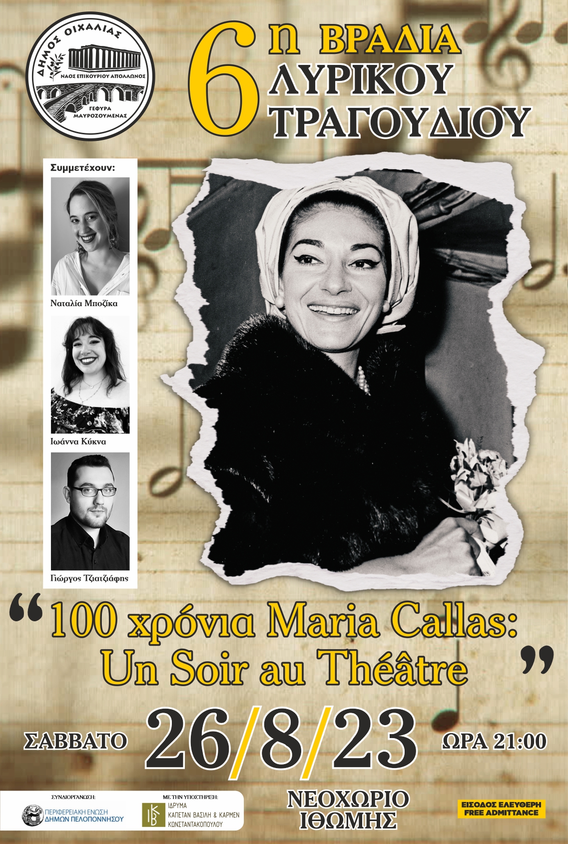 Στα πλαίσια της 6ης βραδιάς λυρικού τραγουδιού η Ιωάννα Κύκνα, η Ναταλία Μποζίκα και ο Γιώργος Τζιατζιάφης (πιάνο), στην πρώτη τους καλλιτεχνική σύμπραξη, θα ερμηνεύσουν ένα πρόγραμμα φόρο τιμής στη μεγαλύτερη Ελληνίδα λυρική τραγουδίστρια – ωδή στην οπερέτα και το λυρικό τραγούδι, σε ελληνικό και γαλλικό ρεπερτόριο όπου θα ακουστούν γνωστές άριες και ντουέτα από τον Ζακ Όφενμπαχ καθώς και από τους πυλώνες της ελληνικής οπερέτας Σακελλαρίδη και Χατζηαποστόλου.